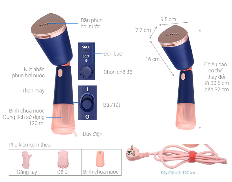 - Chiều dài dây điện 197 cm mang lại sự thuận tiện cho người dùng khi di chuyển trong quá trình ủi quần áo.