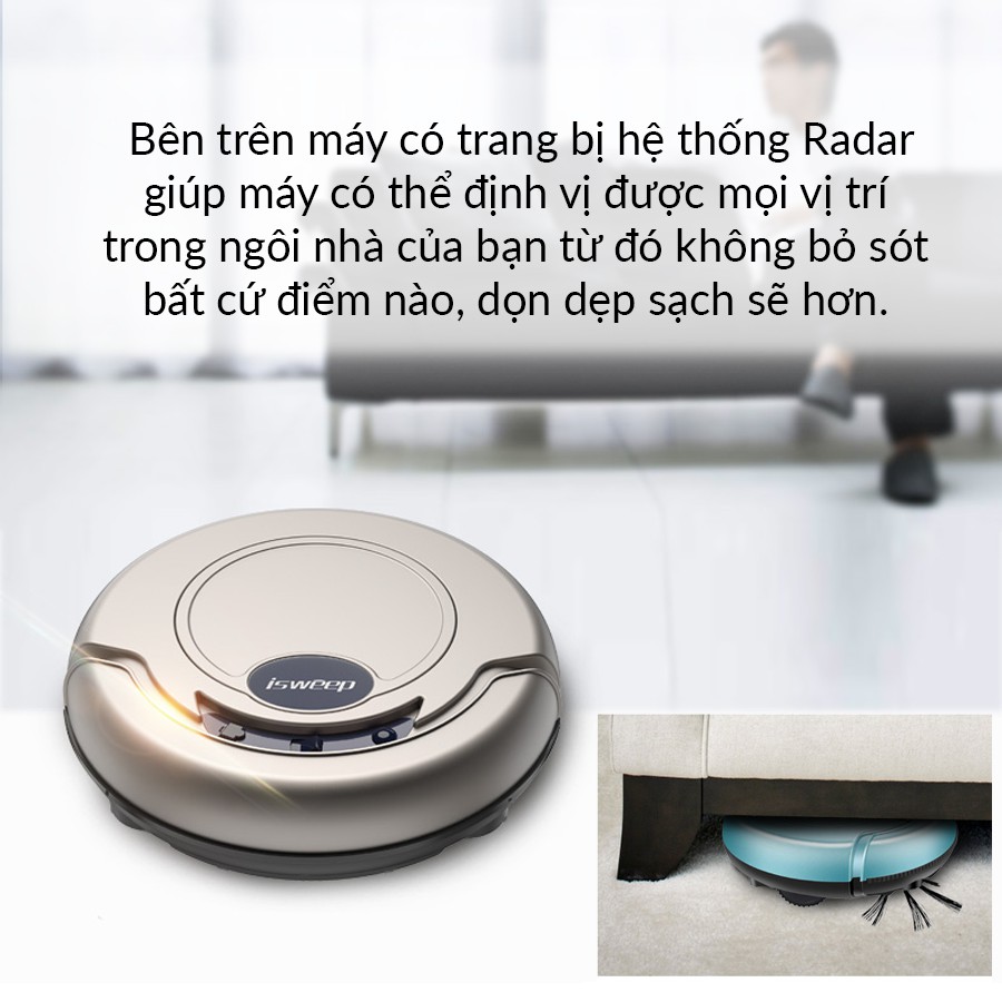 * Bên trên máy có trang bị hệ thống Radar giúp máy có thể định vị được mọi vị trí trong ngôi nhà của bạn từ đó không bỏ sót bất cứ điểm nào, dọn dẹp sạch sẽ hơn.