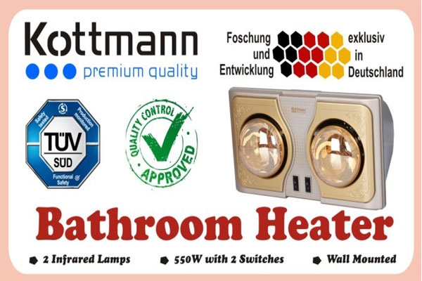 - Đèn sưởi nhà tắm Kottmann có 2 bóng dòng vàng(K2B) không chói mắt, không đốt cháy oxy, bóng đèn có màu vàng bởi vậy đã hạn chế việc gây chói mắt so với các dòng khác.