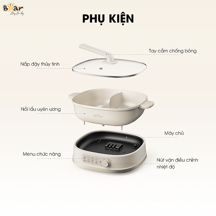 – Nhiều chế độ nấu khác nhau: Lẩu – Hầm/Ninh – Chiên/ Rán – Xào/ Nấu là những tính năng được thiết lập sẵn trên nồi lẩu Bear.