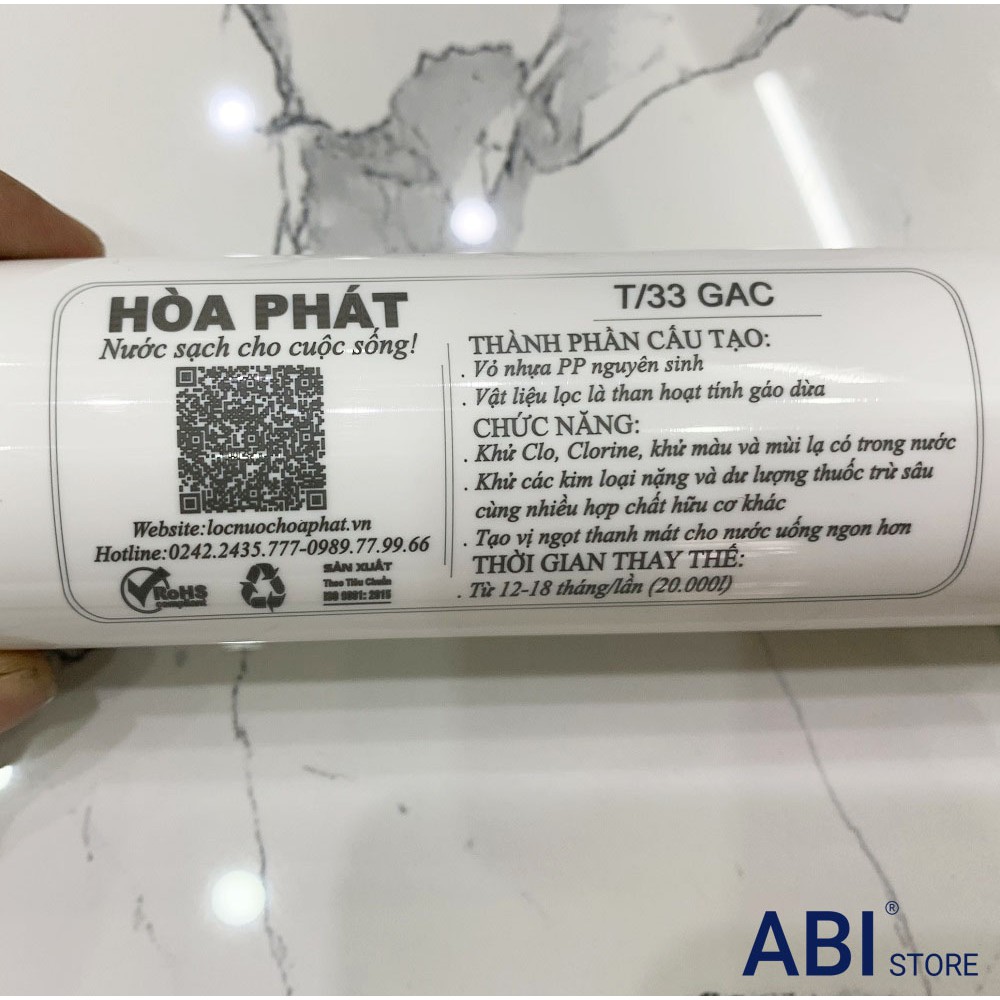 -Lõi lọc số 5 T/33 GAC: vỏ nhựa pp nguyên sinh, vật liệu lọc than hoạt tính gáo dừa. Khử Clo, Clorine, khử màu và mùi lạ trong nước, khử các kim loại nặng và dư lượng thuốc trừ sâu cùng nhiều hợp chất hữu cơ khác, tạo vị ngọt thanh mát cho nước uống ngon hơn.