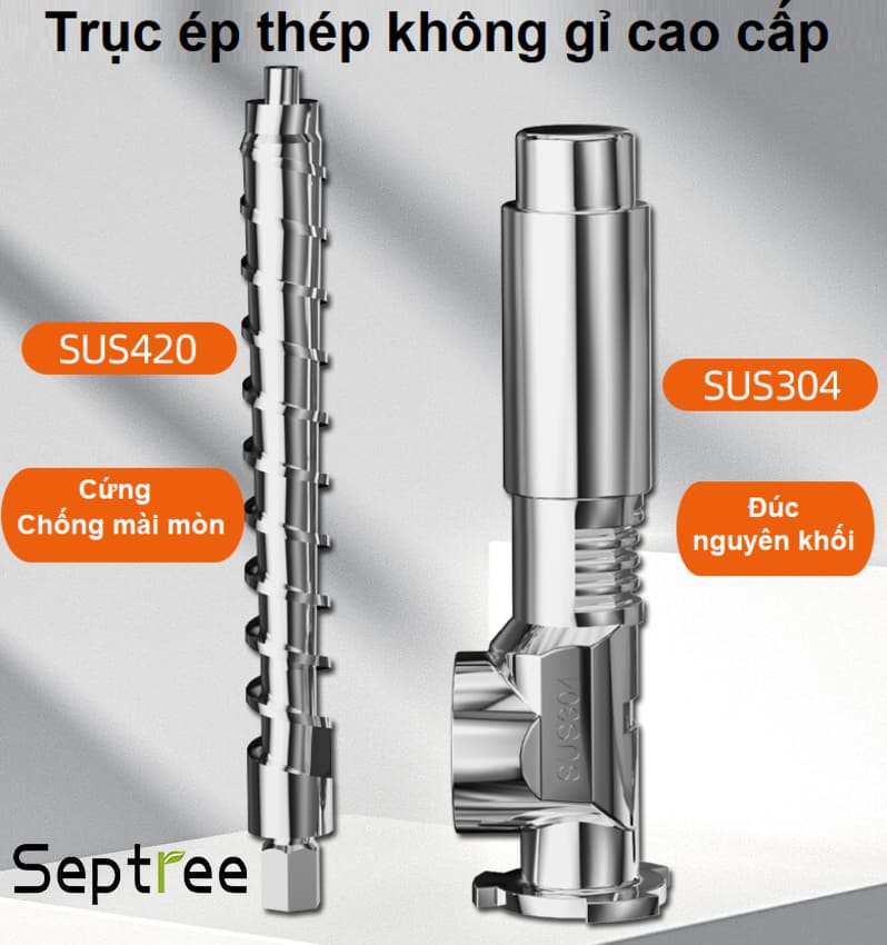 - Trục ép thiết kế dạng cài, tháo lắp nhanh chóng, trục ép bằng Inox 420 dạng xoắn tháp ép nhanh hơn, kiệt dầu hơn