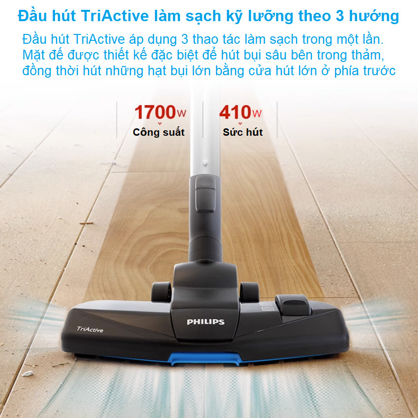 - Đầu hút TriActive áp dụng 3 thao tác làm sạch trong một lần. Mặt đế được thiết kế đặc biệt để hút bụi sâu bên trong thảm, đồng thời hút những hạt bụi lớn bằng cửa hút lớn ở phía trước. Đường dẫn không khí và bàn chải ở hai bên đầu hút sẽ thu gom bụi và chất bẩn dọc theo chân tường hoặc trên đồ đạc.