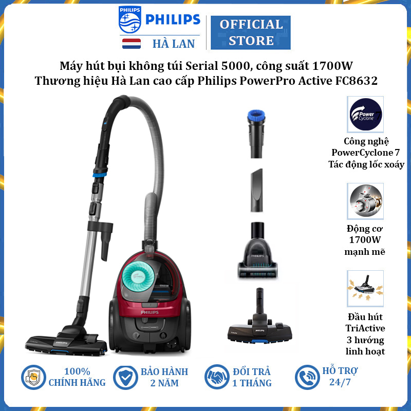 - Máy hút bụi không túi Philips PowerPro Active FC8632 thuộc dòng 5000 là máy hút bụi có sức hút mạnh. Nhờ có công nghệ PowerCyclone 7 và đầu hút TriActive áp dụng 3 thao tác làm sạch được tối ưu hóa trong một lần cho hiệu quả làm sạch tối đa và nhanh chóng