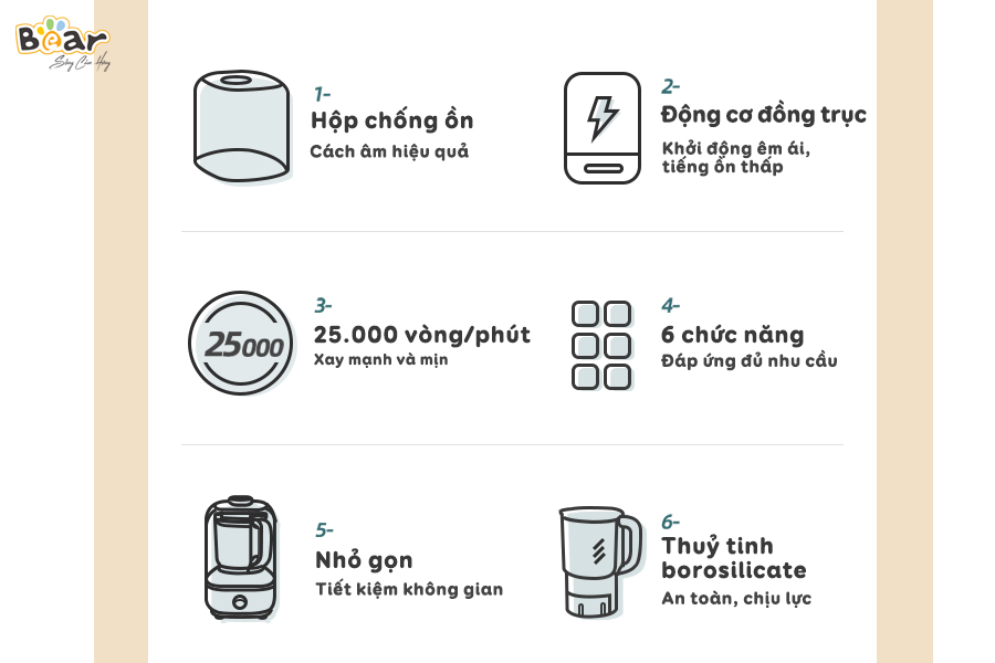 Dung tích lớn, nhiều chức năng cũng thể đổi lại sự thoải mái, thư giãn mà chiếc máy Bear mang lại. Trở dậy sau một giấc ngủ đêm dài, hoặc là về nhà với cảm giác mệt mỏi sau nhiều giờ làm việc, liệu bạn có muốn nghe âm thanh ồn ào từ chiếc máy xay khi vừa vào bếp không? Bear thấu hiểu điều đó và cho bạn giải pháp tuyệt vời trong sản phẩm này. Sự kết hợp của hộp chống ồn và hệ thống động cơ đồng trục giúp máy cách âm và giảm rung đến mức tối đa giúp bạn thoải mái nấu nướng ngay bên cạnh mà không bị làm phiền.