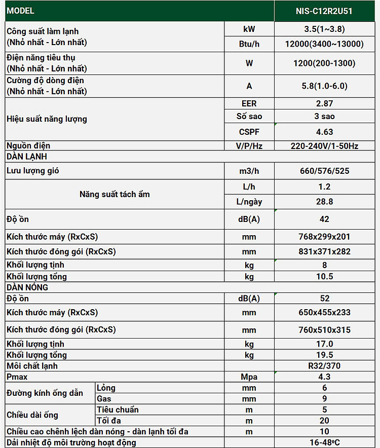 | Trọng lượng sản phẩm | Dàn nóng nặng 19.5kg; Dàn lạnh nặng 17kg |