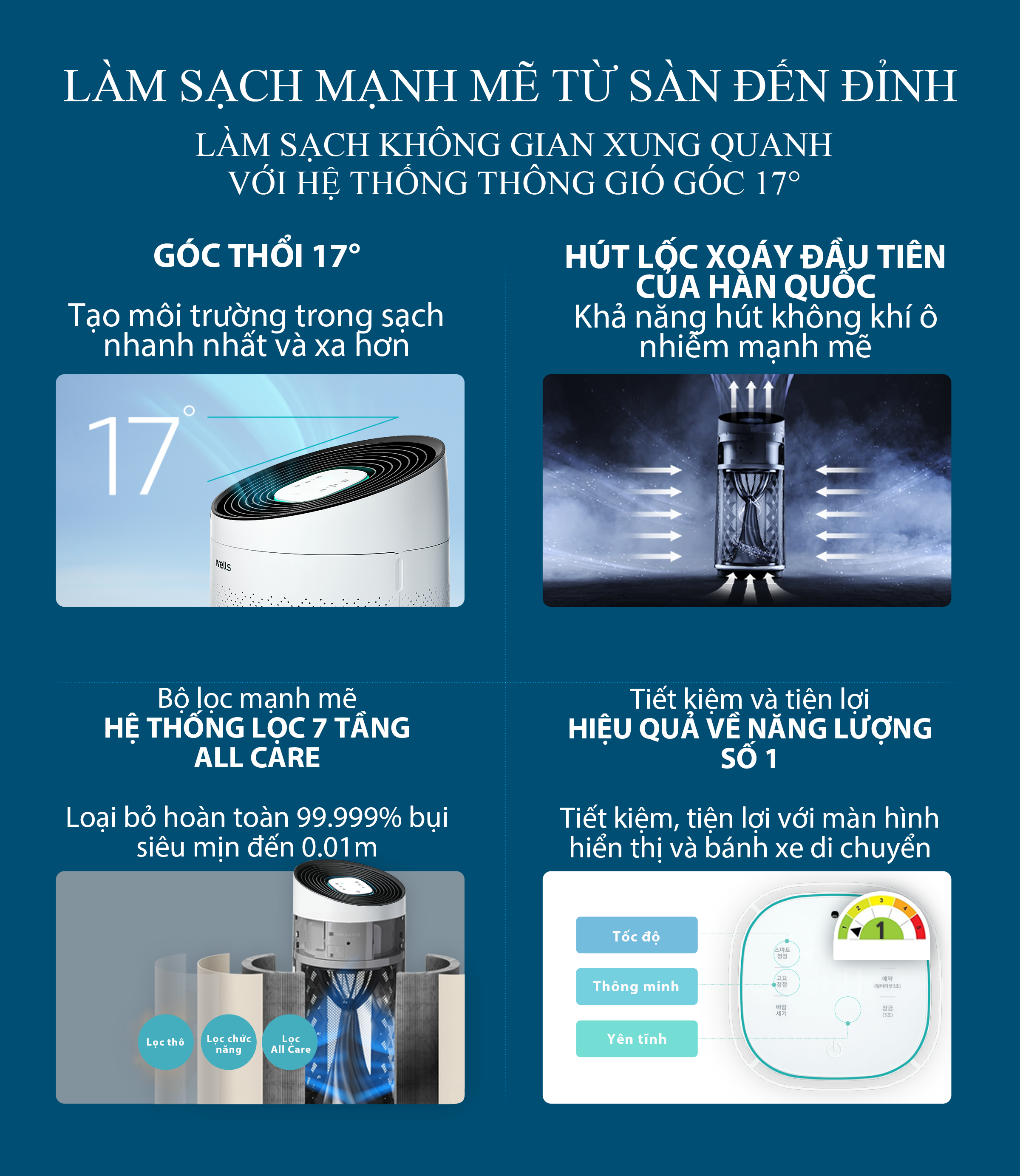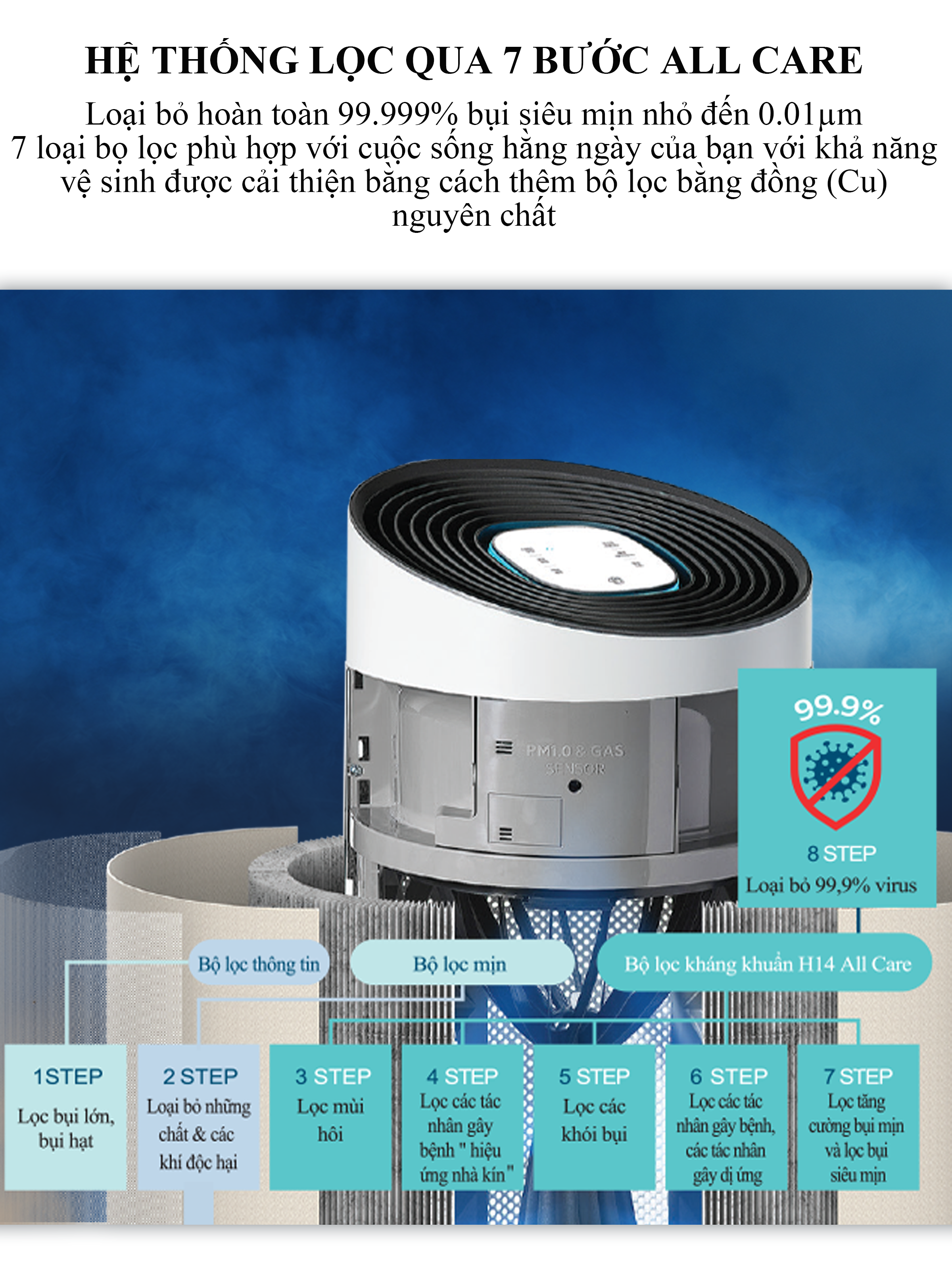 Bộ lọc bụi cho máyMàng lọc của Wells Jet Blue gồm 4 bước lọc:Màng lọc thô: Lọc bụi kích thước lớn và lông thú cưngMàng lọc chức năng (6 màn lọc chức năng phù hợp với từng môi trường sống):+ Bụi siêu mịn: Môi trường sống cạnh những tuyến đường lớn hoặc những nơi có khu công nghiệp,...+ Dị ứng: Gia đình có em bé hoặc những người dễ bị dị ứng với phấn hoa, thú cưng, thời tiết thay đổi,...+ Khử mùi: Môi trường gần nơi những quán ăn hoặc có những không gian trong nhà cần được khử mùi,...+ Nhà mới: Không gian vừa được xây dựng hoặc những ngôi nhà mới,...+ Khói: Môi trường có khói do nấu ăn, khói thuốc lá, khói xe,...+ Thú cưng: Mùi do chất thải của thú cưng, lông tơ nhỏ của thú cưng,...(Bộ lọc chức năng có thể được thay đổi 3-6 tháng 1 lần tùy theo nhu cầu sử dụng của bạn)Màng lọc khử mùi: Khử mùi hôi, khí độc hại, loại bỏ những vật chất gây hội chứng bệnh nhà kín (thường xảy ra tại những căn hộ chung cư)Bộ lọc All Care 14: Bao gồm khử mùi, lọc các tác nhân gây hiệu ứng nhà kín, lọc khói bụi, lọc các tác nhân gây bệnh, các tác nhân gây dị ứng, lọc tăng cường bụi mịn.