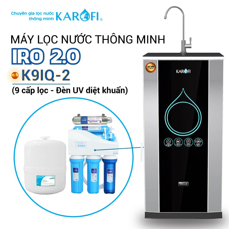 Máy lọc nước RO KAROFI iRO 2.0 K9IQ-2 (9 cấp lọc - Đèn UV diệt khuẩn) của hãng điện gia dụng hàng đầu KAROFI - Chuẩn mực mới nhất của làm nước sạch và an toàn.Các nguồn nước đầu vào có thể nhiễm bẩn nhưng sau khi qua hệ thống lọc nước sẽ đều cho ra nước tinh khiết với tất cả những chất bẩn, chất độc hại bị loại bỏ hoàn toàn, mang lại sự an tâm cao cho người sử dụng.