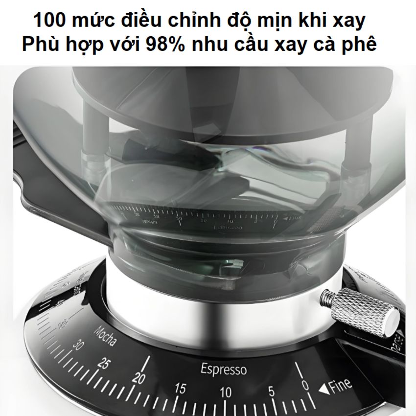 - 100 mức cài đặt xay: Thang điều chỉnh kích thước hạt xay đa năng, chính xác, phù hợp với nhiều phương pháp pha chế, từ espresso mịn đến French press và cold brew thô.