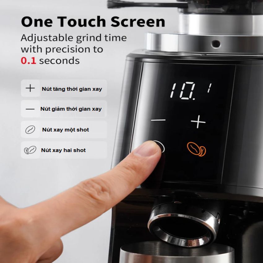 - Tùy chỉnh thời gian xay cho ly đơn, ly đôi và chế độ liên tục với độ chính xác 0,1 giây, cho phép điều chỉnh lượng cà phê theo khẩu vị.