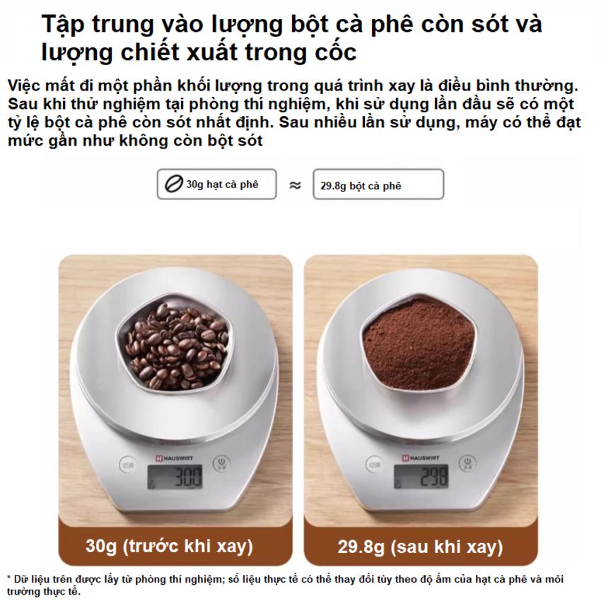 - Ống xả từ tính có thể tháo rời, lưỡi xay trên và phễu đựng hạt có thể tháo rời, kèm dụng cụ nén bột để làm sạch bã cà phê còn sót lại.