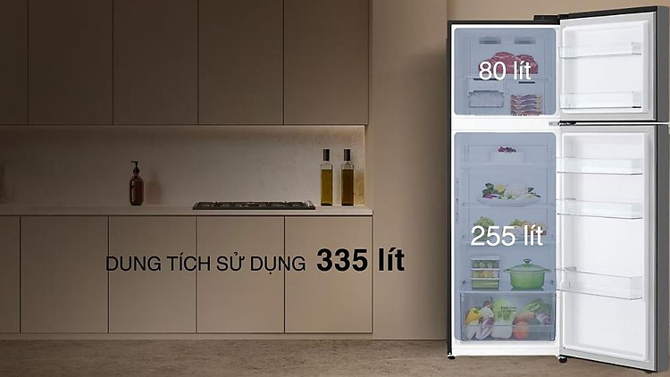 – Dung tích tủ lạnh LG 335 lít phù hợp sử dụng trong gia đình 3 – 4 người, đáp ứng tốt nhu cầu bảo quản thực phẩm đa dạng từ đồ tươi sống đến đồ uống và rau củ