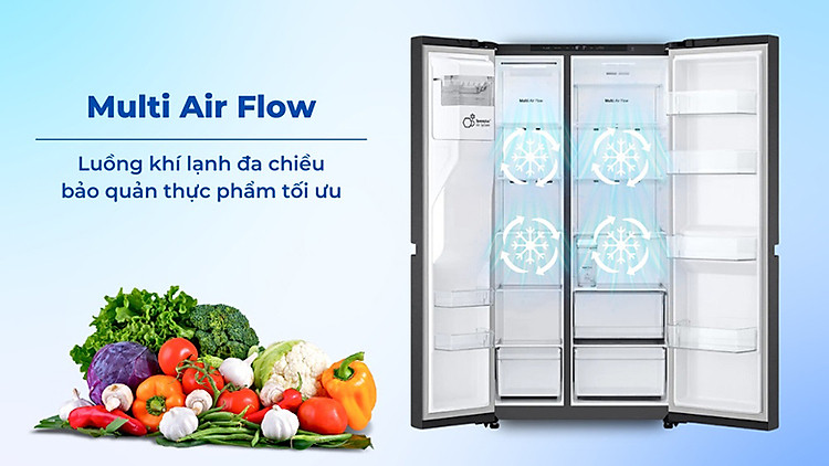 Công nghệ Multi Air Flow phân bổ khí lạnh đồng đều khắp mọi ngóc ngách trong tủ lạnh, giúp duy trì nhiệt độ ổn định và độ ẩm lý tưởng ở mọi vị trí, từ ngăn đông đến ngăn mát. Nhờ vậy, thực phẩm không chỉ giữ được độ tươi ngon mà còn hạn chế tình trạng hư hỏng hay khô héo.
