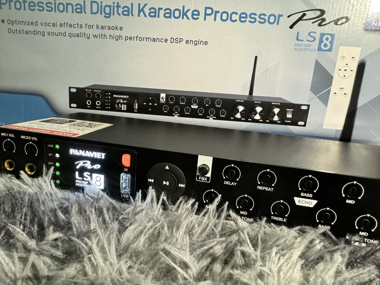 - Về tính năng của vang cơ PANAVIET PRO LS-8 không chỉ có thiết kế thông minh, thân thiện với người dùng mà còn sở hữu nhiều tính năng vượt trội như: kết nối không dây bluetooth + giải mã tính hiệu số cổng quang + hỗ trợ usb PANAVIET PRO LS-8 có tính năng như một cossiver cơ tách và điều khiển tín hiệu cho loa trầm , và loa center Khả năng triệt tiêu hú rít cực tốt: Được trang bị mạch chống hú feedback với công nghệ dịch tần số giúp giảm tình trạng hú rít lên đến 90% mà không gây ảnh hưởng tới chất lượng âm thanh. Hơn nữa PANAVIET PRO LS-8 còn có khả năng giảm ồn mang tới âm thanh sạch nhất khi sử dụng. đi cùng là 2 ic TM nổi tiếng về khae năng sủ lý mang lại tiếng echo mềm mịn , đỡ giọng hát nhẹ nhàng , bay bổng hơn.